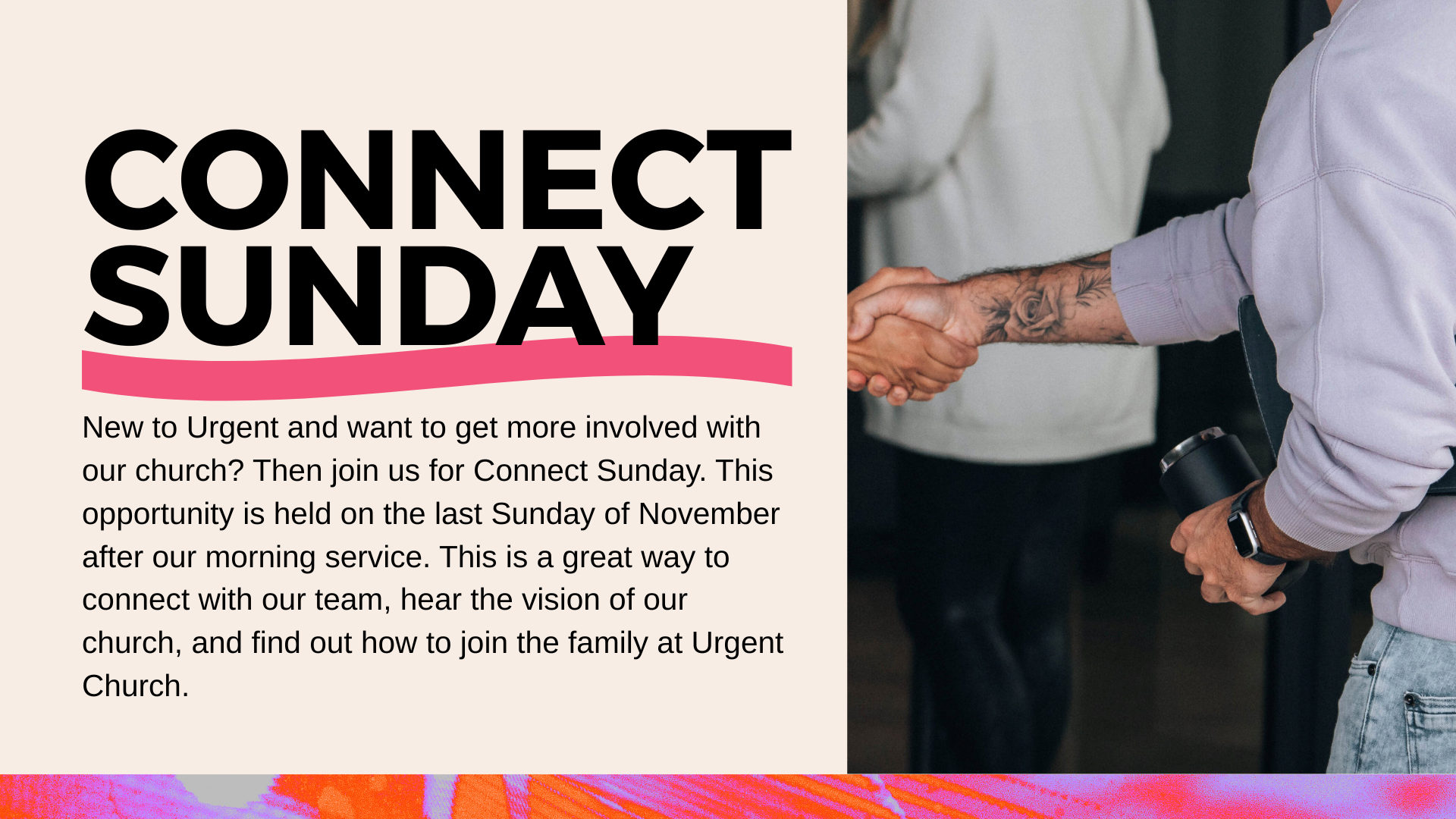 New to Urgent and want to get more involved with our church? Then join us for Connect Sunday. This opportunity is held on the last Sunday of November after our morning service. This is a great way to connect with our team, hear the vision of our church, and find out more about what it means to be apart of Urgent Church.