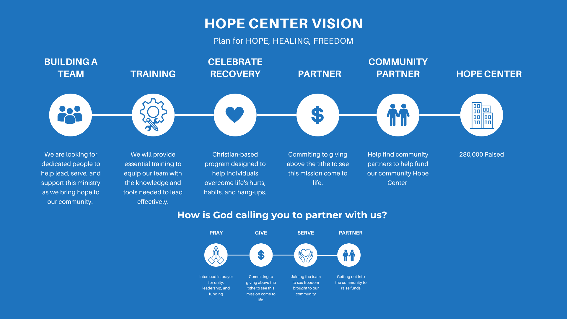 Our vision is to begin to focus on building a ministry team that brings Celebrate Recovery to Urgent Church. We believe that this is our best next step as we raise funds to build the Hope Center. In this image you will see the necessary next steps that will need to happen before we see the center finished.